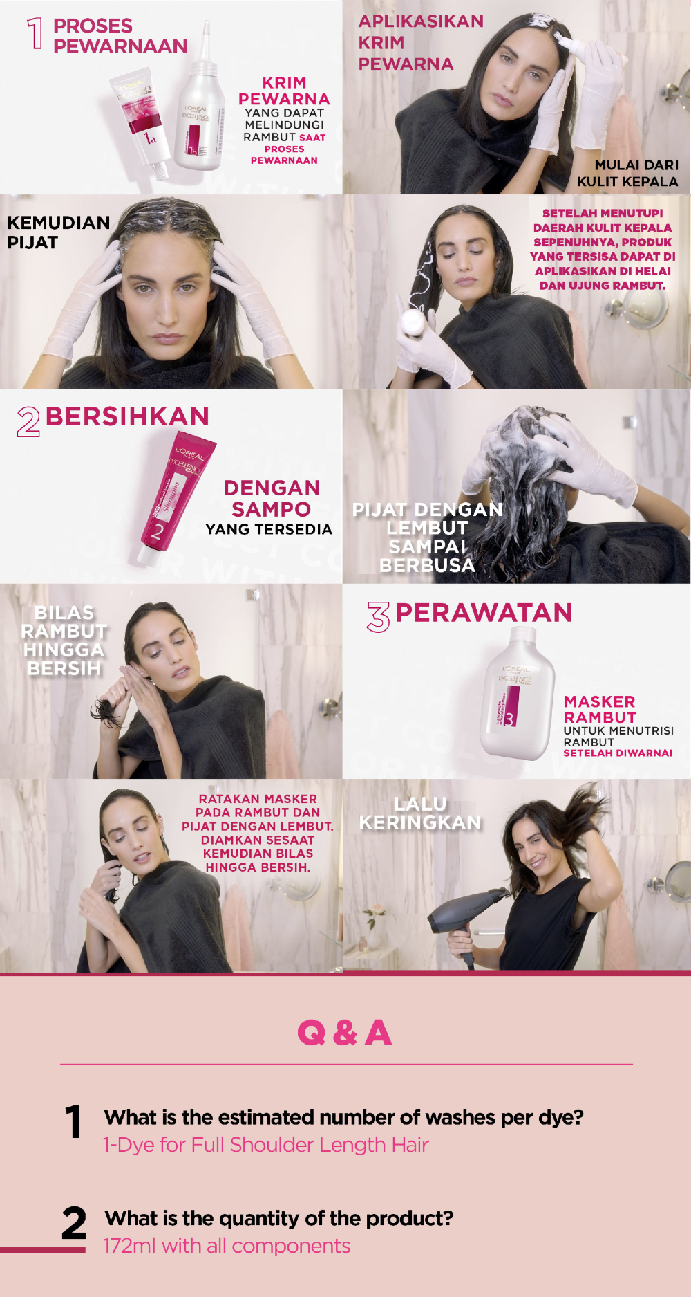 Pewarna rambut dengan Triple-Care Protection, sebuah formula yang diperkaya dengan Ceramide, Pro-Keratin, dan Collagen yang membantu merawat, melindungi, dan menutrisi rambut.