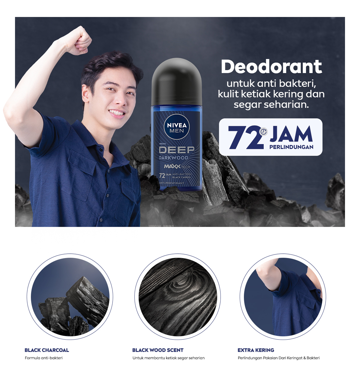 NIVEA MEN Deodorant Roll On Deep Darkwood 50ml - Deodoran pria melawan bakteri keringat bau badan dengan wangi parfum premium maskulin blackwood menjaga ketiak kering tahan lama seharian - Antiperspiran, Black charcoal
