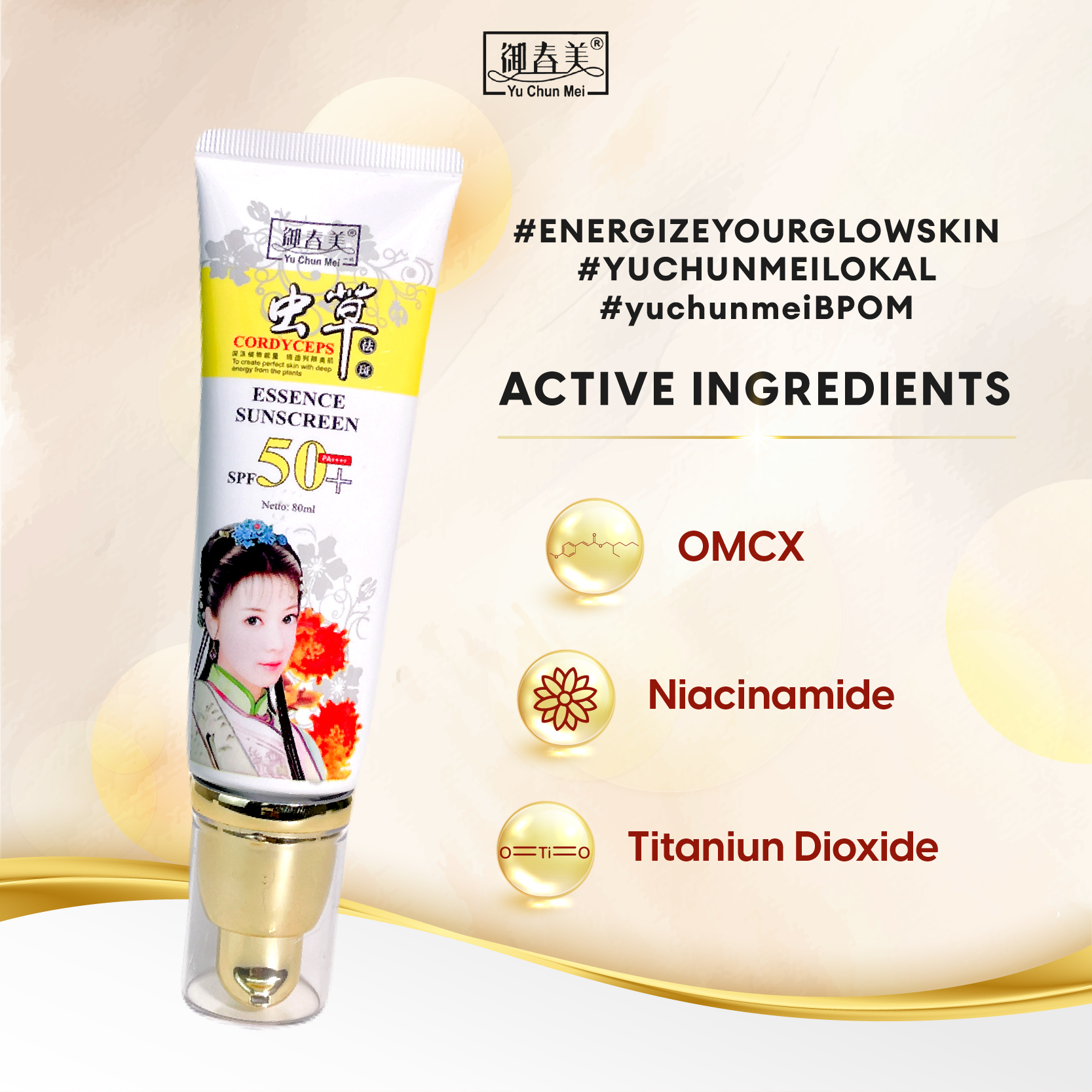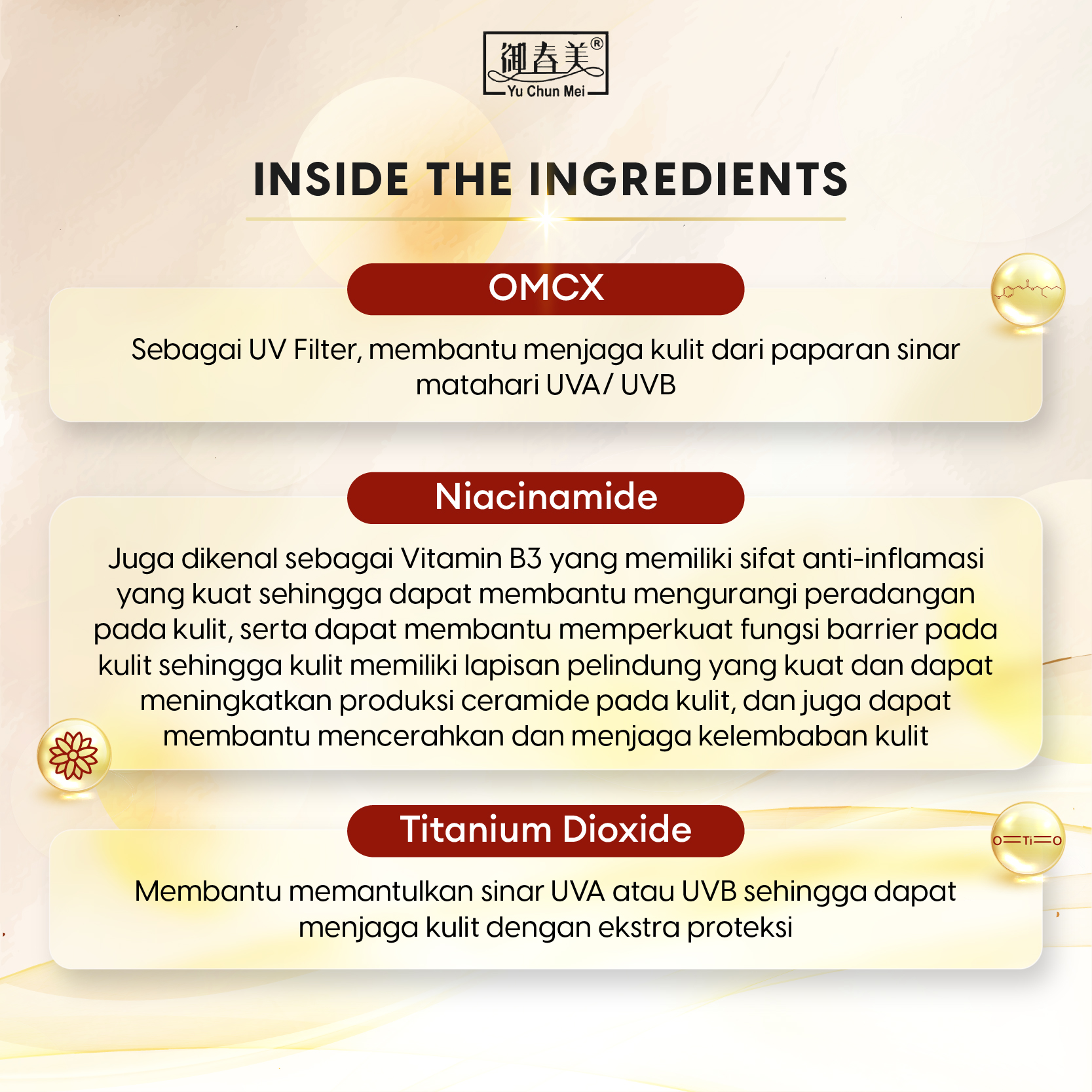 YU CHUN MEI Sunscreen UV Defender 80ml-SPF50/PA++++ memiliki beberapa kandungan unggulan yang dapat membantu menjaga kulit dari paparan sinar UVA dan UVB sehingga membuat kulit tetap sehat, yaitu diantaranya : OMCX, Titanium Dioxide, Niacinamide and Allantoin