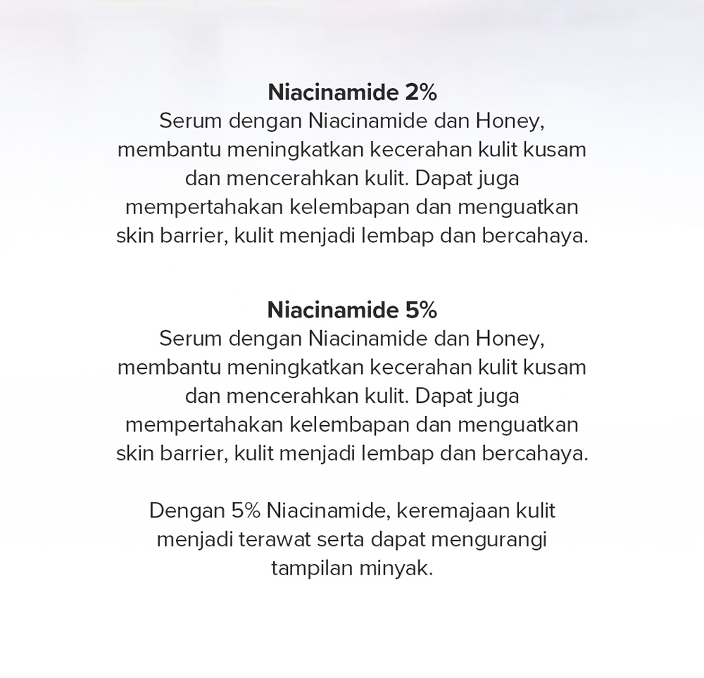 Honey Glow Brightening Serum 2% adalah serum dengan Niacinamide dan Honey yang berfungsi untuk membantu mencerahkan kulit kusam, mempertahankan kelembapan, serta menguatkan skin barrier sehingga kulit menjadi lembap dan bercahaya. Dengan Niacinamide 2% dan BHA 0,5% meningkatkan keremajaan kulit serta dapat mengurangi sebum di wajah. Teksturnya kental namun tidak terasa lengket setelah menyerap ke dalam kulit.