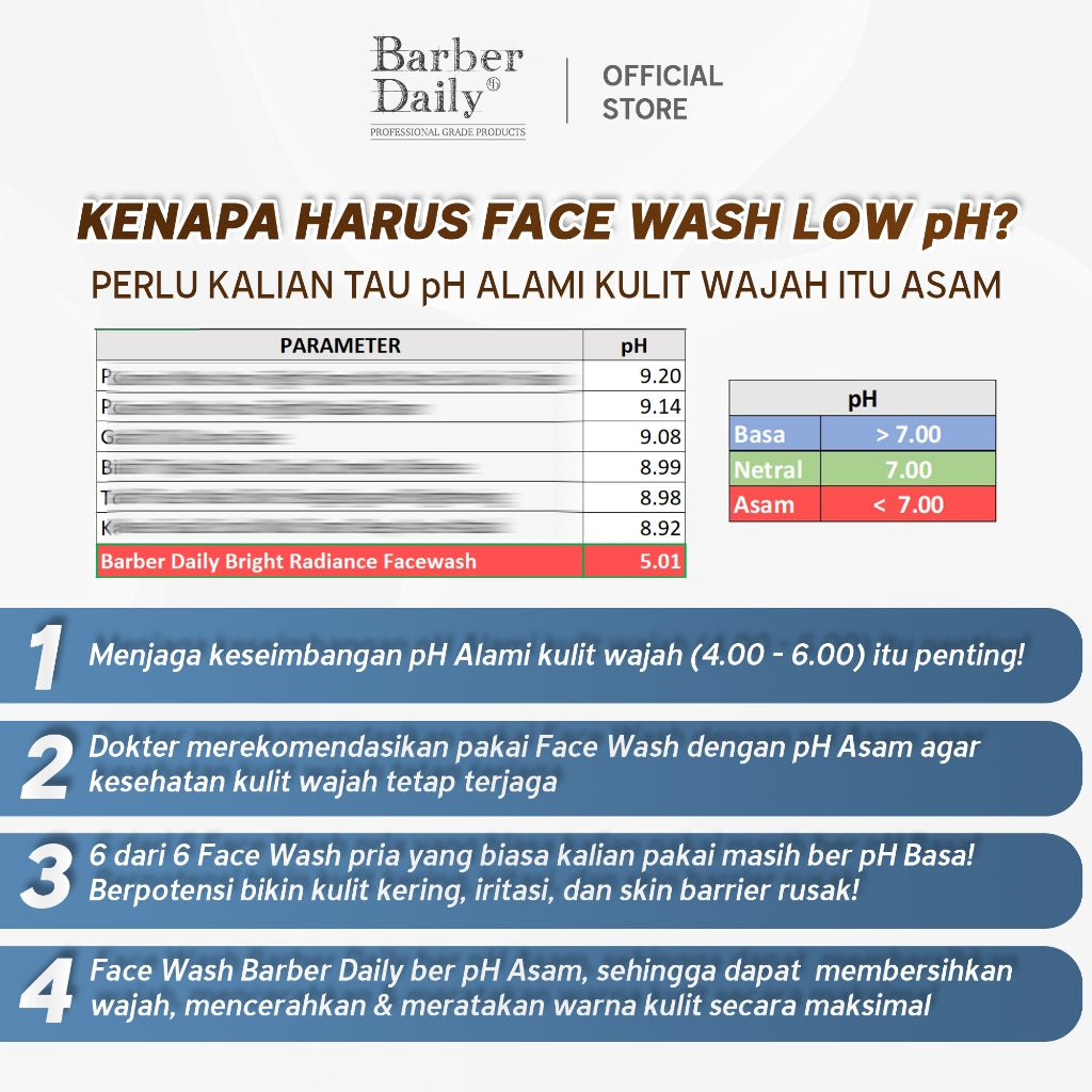Barber Daily Bright Radiance Face Wash with 2% Niacinamide, Low pH and Gentle Formulation jadi awal perubahan face wash pria jadi lebih baik. Dirancang khusus untuk basic grooming routine pria, face wash ini 3X LEBIH EFEKTIF UNTUK MENCERAHKAN KULIT dengan kandungan 3 bahan pencerah terbaik . Dengan gentle formulation yang lembut dipastikan dapat membersihkan kotoran secara menyeluruh tanpa membuat kulit kering, iritas, dan ketarik.