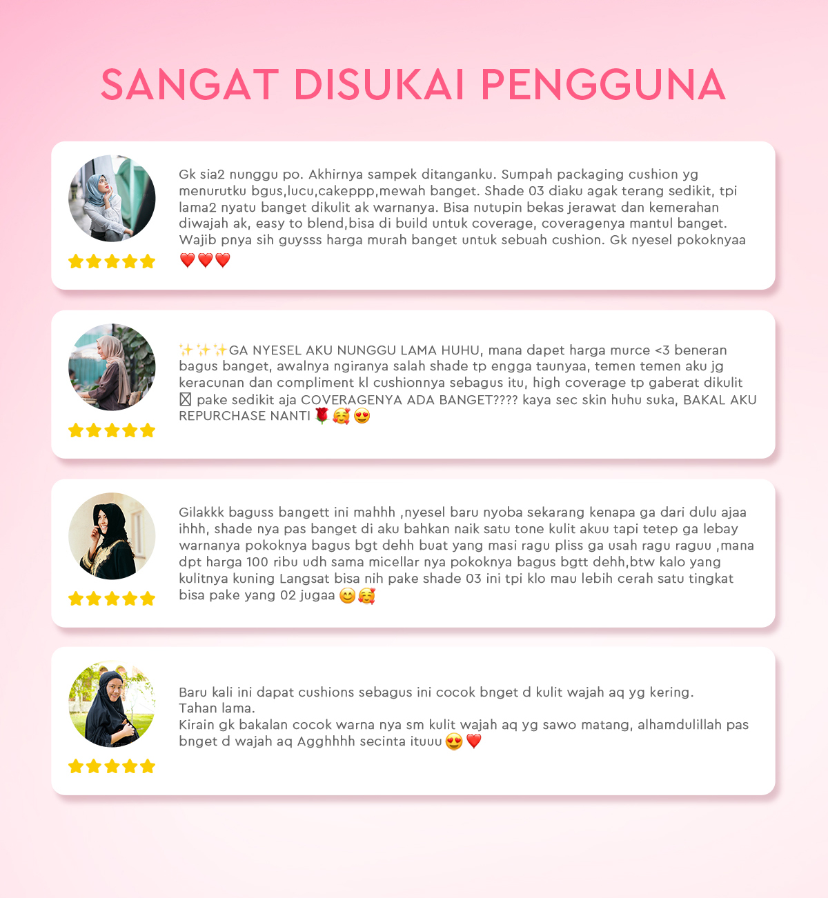 Cushion dengan kandungan skincare, coverage tinggi namun terasa ringan di wajah. Dilengkapi puff dengan bentuk unik, menjangkau setiap sudut area wajah lebih mudah dan merata. Mengandung Mix Berry Extract, Panthenol dan Tocopherol, mencegah kekusaman dan kulit kering sepanjang hari. Hasil akhir semi matte yang memberikan tampilan akhir sempurna. Tersedia dalam 5 shades yang cocok untuk kulit Asia, terutama Indonesia.