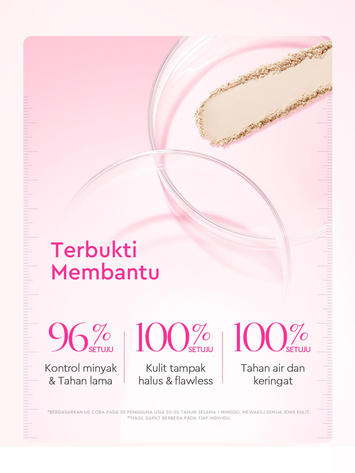 Bedak tabur ringan dengan Air Blurry Technology yang langsung menyamarkan, mengunci riasan, dan mengontrol minyak hingga 12 jam. Memberikan hasil akhir matte yang halus dengan coverage ekstra, tanpa rasa kering atau efek flashback. Tersedia dalam 3 pilihan warna sesuai warna kulit dan 1 warna translucent universal.