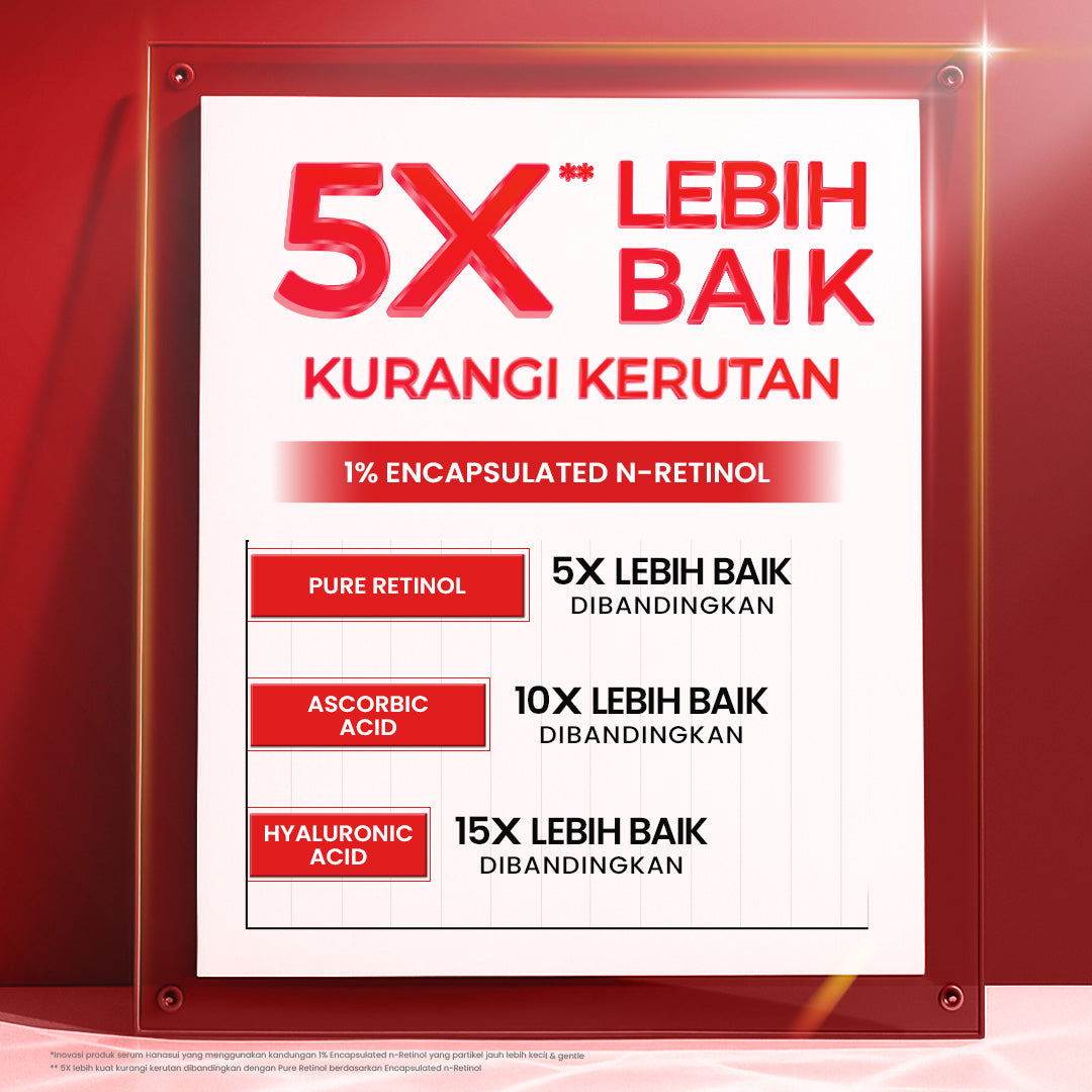 Produk serum wajah dengan kandungan 1% Encapsulated n- Retinol yang memiliki fungsi dalam menunda tanda-tanda penuaan dini pada wajah seperti garis halus, kerutan, dan bintik hitam. Produk ini juga dilengkapi dengan kandungan 5X Ceramide yang berperan dalam membantu memberikan kelembapan, merawat skin barrier sehingga kulit tampak lebih kenyal dan sehat. Diperkaya dengan kandungan Madagascar Centella, produk ini membantu menenangkan kulit yang reaktif sehingga produk ini cocok digunakan untuk semua jenis kulit