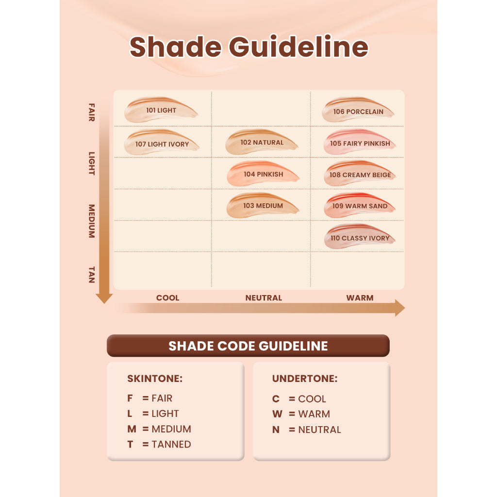 Serum cushion dengan hasil akhir matte mengandung kombinasi Niacinamide, Sodium Hyaluronate, dan Peptide memberikan coverage sekaligus manfaat perawatan kulit. Dengan tekstur ringan yang menyatu di kulit menciptakan tampilansempurna yang bertahan sepanjang hari.