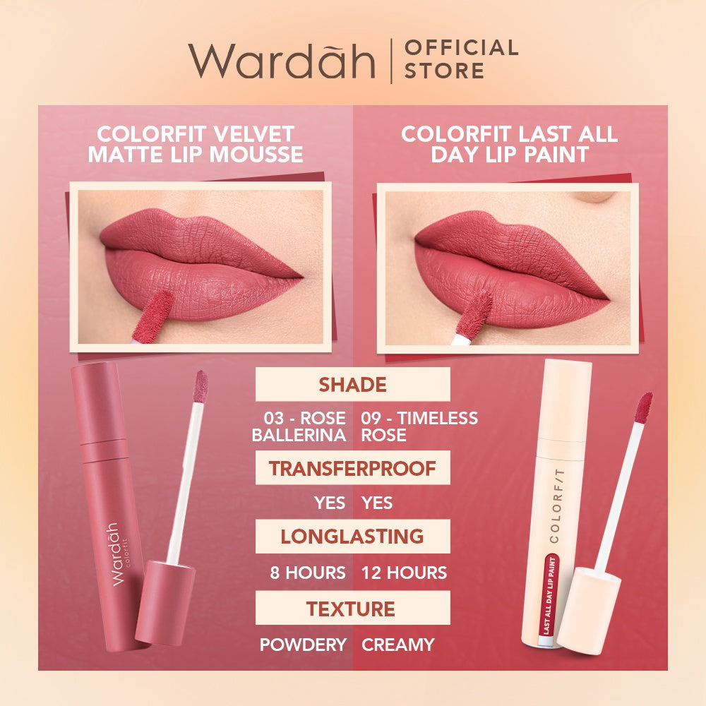Wardah Colorfit Last All Day Lip Paint adalah Liquid lip dengan matte finish dan tekstur creamy yang mudah dibaurkan serta intense dalam satu usapan (one swipe coverage). Formulanya tidak transfer (nontransfer) dan tahan lama hingga 12 jam (longlasting up to 12 Hrs) sehingga nyaman digunakan seharian. Terdiri dari 6 varian warna wearable yang cocok untuk berbagai skin tone.