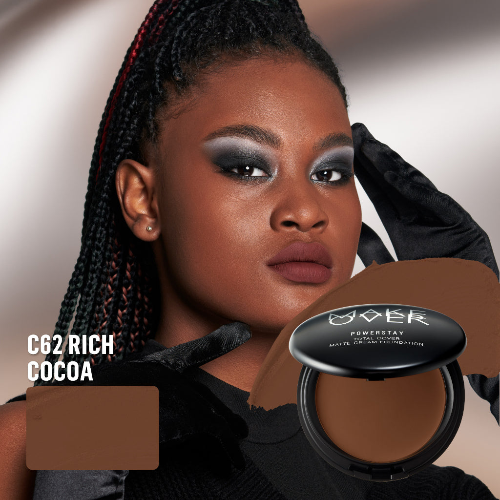 Make Over Powerstay Total Cover Matte Cream Foundation adalah foundation dengan coverage tinggi dan creamy yang super blendable dan tidak terasa berat di kulit. Foundation krim yang didesain khusus untuk menutupi ketidaksempurnaan kulit. Diformulasi dengan soft focus agent, oil absorber, dan UV filter SPF 30 PA++++, melindungi kulit dari paparan sinar matahari dan polusi.