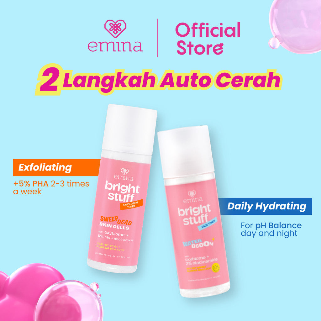 Emina Bright Stuff Exfoliating Toner, Skin Reboot: Unclog, Protect, Radiate! diformulasikan dengan 5% PHA dan Oxybiome kombinasi yang powerful namun tetap gentle pada kulit tanpa menimbulkan iritasi. Bright Stuff Exfoliating Toner mampu mengangkat sel kulit mati dan menghasilkan tampilan kulit yang lebih cerah, halus, dan kenyal. Dapatkan Bright, Bouncy, Glowing Skin dalam 14 hari!