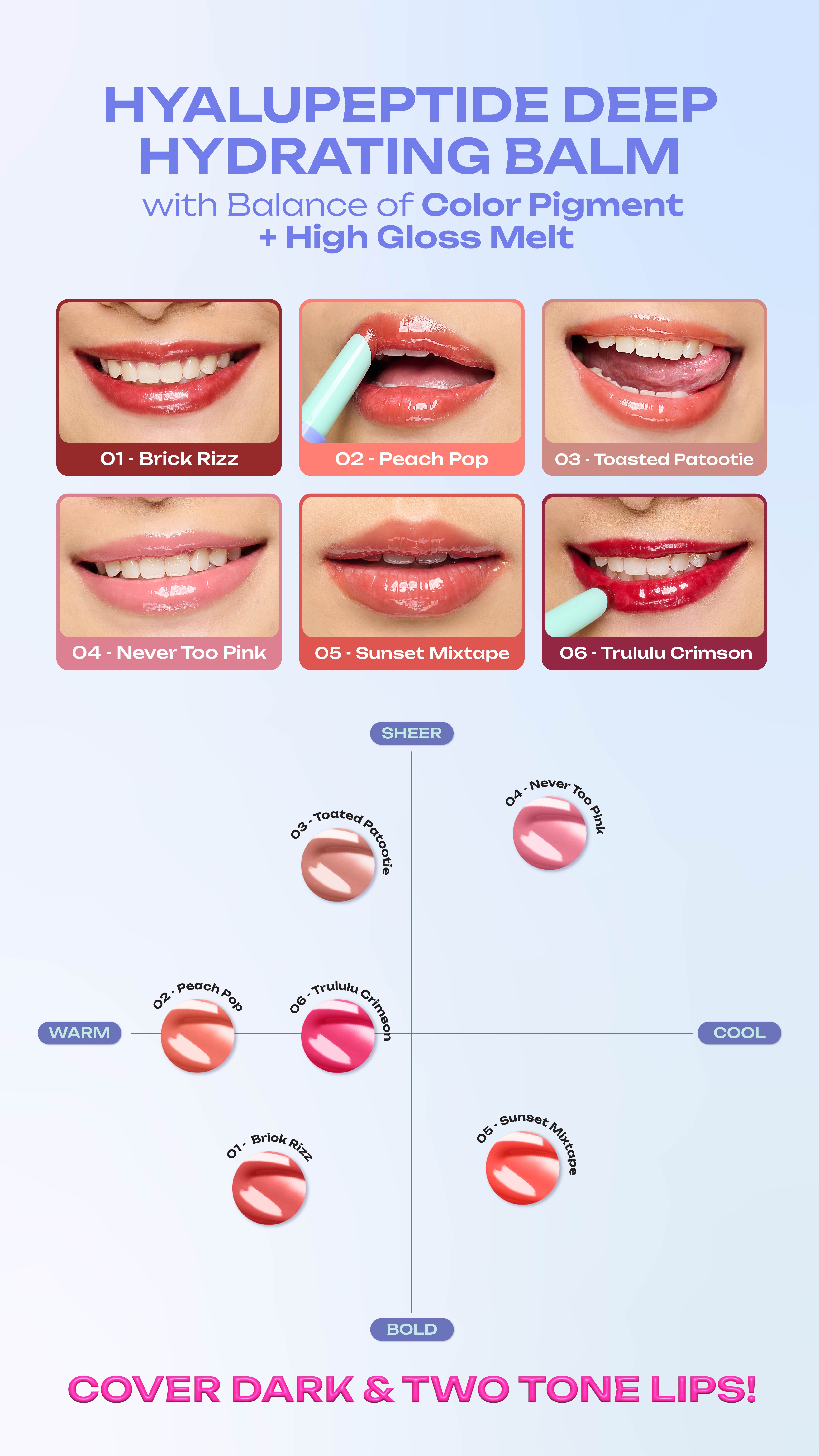 - Mengandung Hyalupeptide – gabungan dari Hyaluronic acid dan tri-peptide yang mampu memberikan hidrasi mendalam hingga level sel serta memperbaiki tekstur bibir sehingga memperkuat lip barrier.