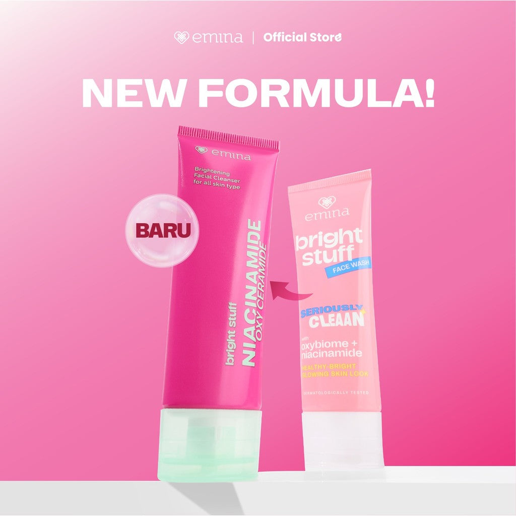 NEW Formula! Emina Brightening Face Wash with Niacinamide & Oxy Ceramide, sabun cuci muka yang cocok digunakan untuk masalah kulit kusam. Diformulasikan khusus untuk dapat membersihkan kotoran di wajah hingga ke pori, wajah tampak cerah dalam 1x bilas, dan mengontrol minyak tanpa merusak skin barrier.