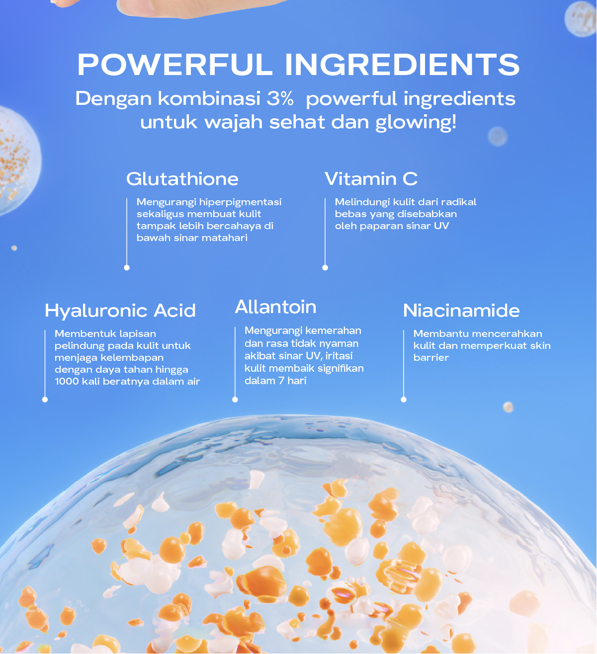 Sunscreen Serum SPF 35 PA+++ dengan tekstur ringan dan non-greasy untuk semua jenis kulit. Diformulasikan dengan Vitamin C, Niacinamide, dan Luminescine, melindungi kulit dari sinar matahari sekaligus mencerahkan dan menghidrasi kulit yang kusam sehingga kulit cerah dan lembab tanpa rasa berminyak. Melindungi dari 8* penyebab permasalahan kulit untuk memelihara kulit.
