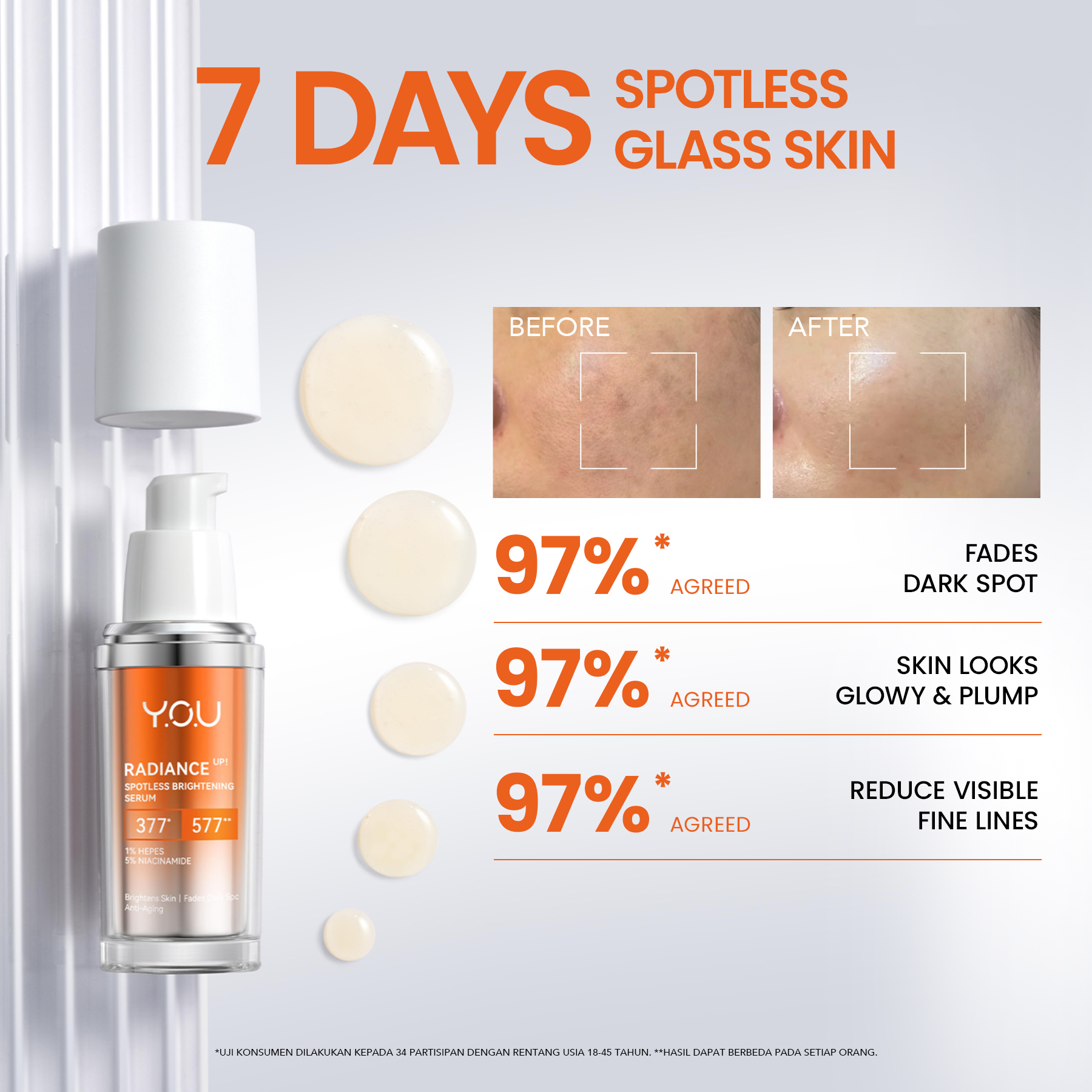 Untuk hasil optimal, gunakan rangkaian Y.O.U Radiance Series secara rutin selama 2-4 minggu.