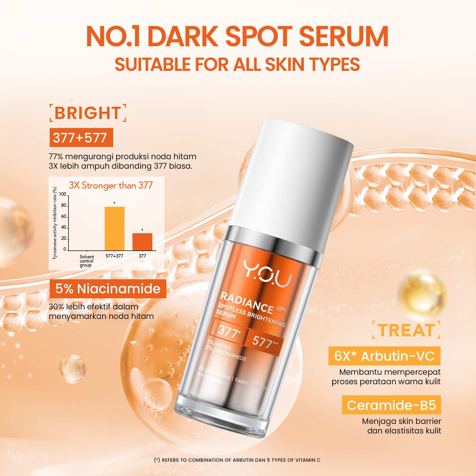 - 377 + 577: Gold standard terbaru untuk dark spot! → 3X lebih efektif memudarkan & mencegah dark spot dibanding 377.