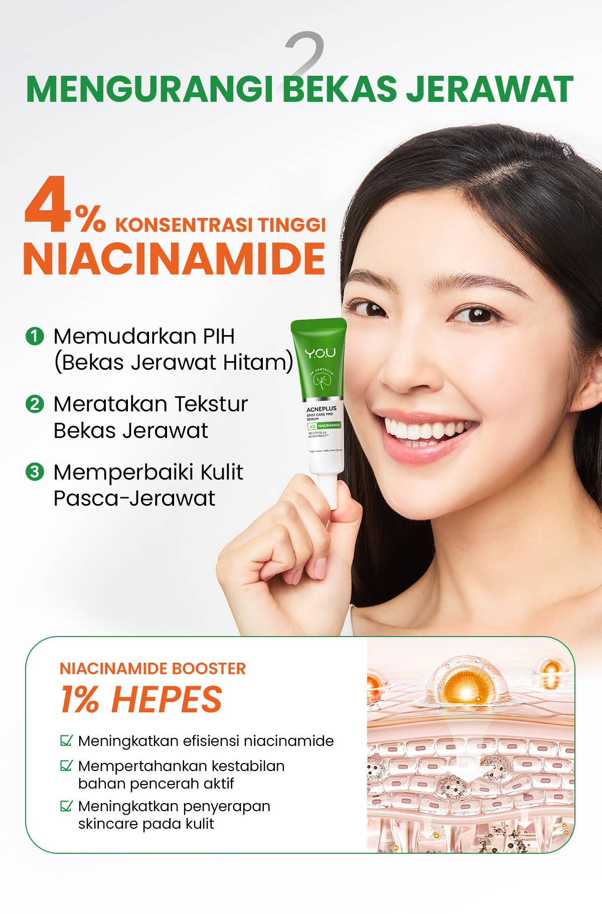 [New Upgraded] Obat totol jerawat bertekstur serum yang mengandung teknologi anti-acne terbaru dari YOU, AcneXtract™, 4% Niacinamide, 4D Centella, and Salicylic Acid yang melawan jerawat, menenangkan kemerahan, dan membantu menyamarkan bekas jerawat. Cocok untuk kulit sensitif dan berjerawat.