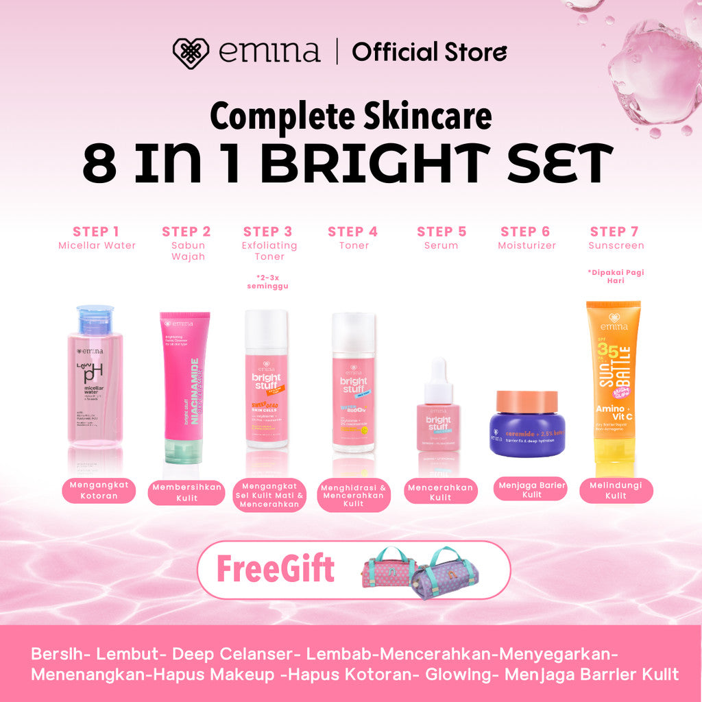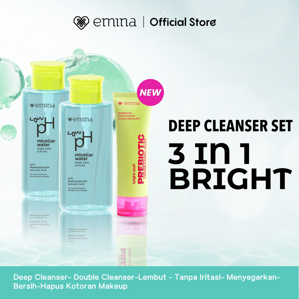 [Paket Deep Cleanser Free Gift ] Paket 8 in 1 2 in 1 Paket 3 in 1 Deep Cleanser Emina HyaluBright & Smooth Low PH Micellar Water 300ml- Face Wash Serum Toner Moisturizer Sunscreen -Lembut - Tanpa Iritasi- Menyegarkan- Bersih-Hapus Kotoran Makeup