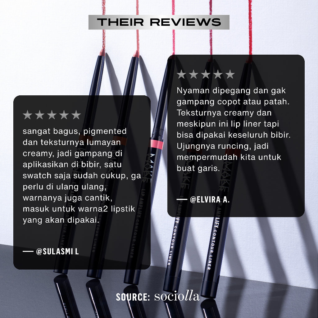 Make Over Lip Amplify Contour Liner an easy-to-apply lip liner for a precise and well defined contour line. With the cover-matte formula, it can be used alone to fill all areas of your lips or layered with your favourite lipstick to prolong its staying power without drying. Get a fuller audacious lips and more defined pout.