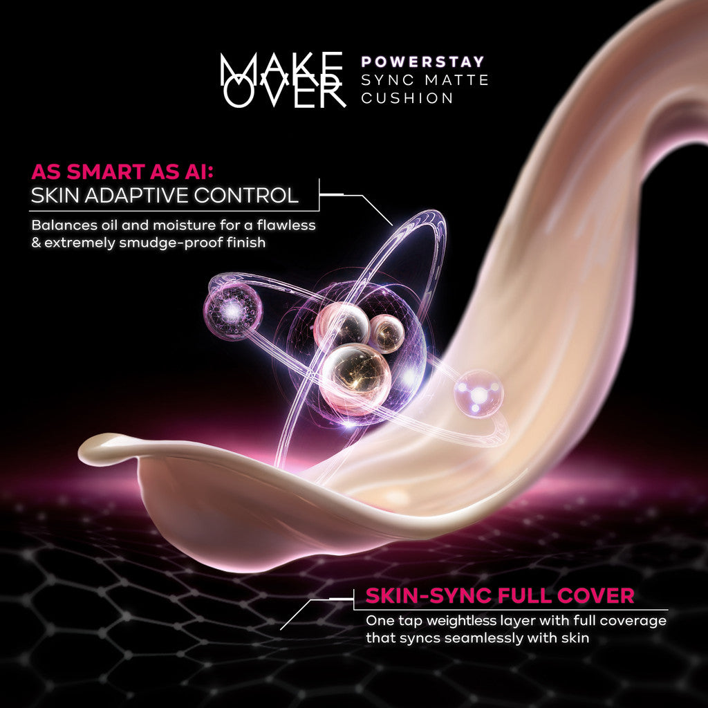 Make Over Powerstay Sync Matte Cushion merupakan cushion tahan lama yang memberikan hasil flawless AM to AM finish dengan ketahanan 24H Strongwear, Extremely Smudge Proof karena dapat menyesuaikan kondisi kulit selama pemakaian melalui Skin Adaptive Control. Menggunakan teknologi as-smart-as-AI, Skin Adaptive Control dapat mengontrol kadar minyak dan kelembaban pada kulit dengan untuk mempertahankan Demi-Matte finish dan Full coverage pada wajah sejak pertama kali aplikasi.