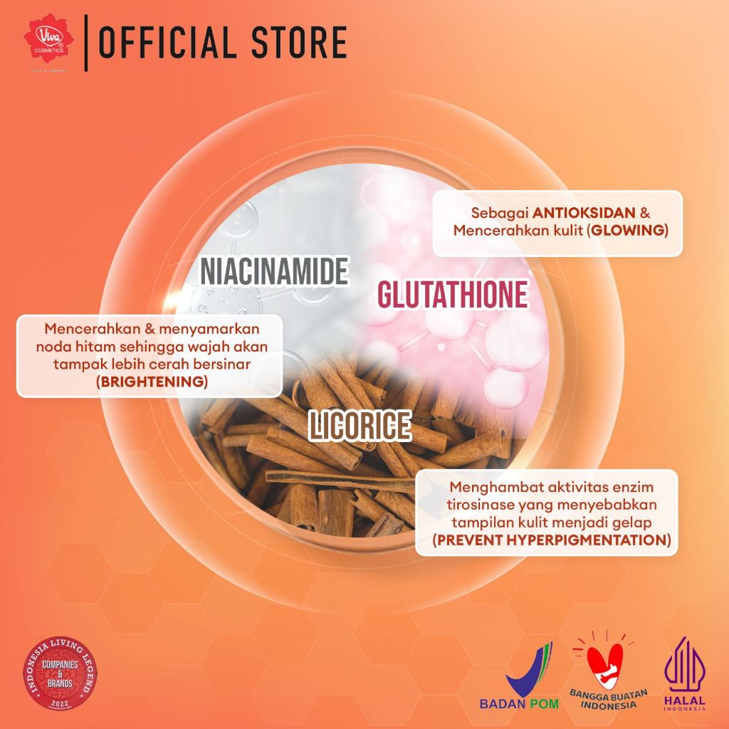 Viva Glowing White Serum ini dirancang dengan kombinasi bahan-bahan aktif, dimana bahan aktif tersebut secara sinergis bekerja efektif dalam mencerahkan rona kulit wajah antara lain: