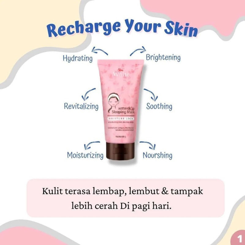 Viva White Waterdrop Sleeping Mask mempunyai teknologi unik dari “WATERDROP” memberikan tetesan nutrisi dan kelembaban langsung di lapisan epidermis, ringan, mudah meresap serta menghidrasi secara maksimal.