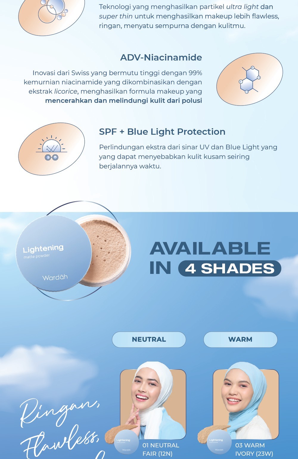 The New Wardah Lightening Matte Powder yang diformulasikan khusus sebagai Makeup + Skincare sehingga mampu memberikan hasil smooth matte yang merata sempurna pada kulit, menyamarkan tekstur kulit untuk meningkatkan tampilan soft pada wajah, dan memiliki coverage yang dapat menemanimu sepanjang beraktivitas! Dengan formula super ringan, teknologi Airy - Coated Particles™, SPF 20 PA++, dan Blue Light Protection yang menyatu sempurna dengan kulit.