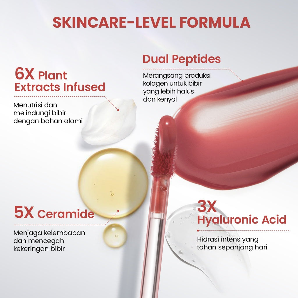 memberikan tampilan bibir glassy yang ringan, transfer-free, dan tahan hingga 24 jam. Diperkaya dengan 6X Botanical Oils, Ceramides, Peptides, dan Hyaluronic Acid untuk bibir yang lembap, plumpy, halus, ternutrisi, dan bercahaya sepanjang hari