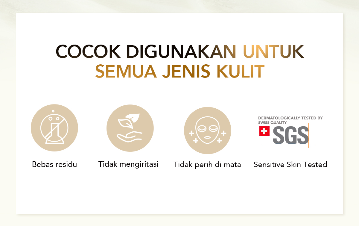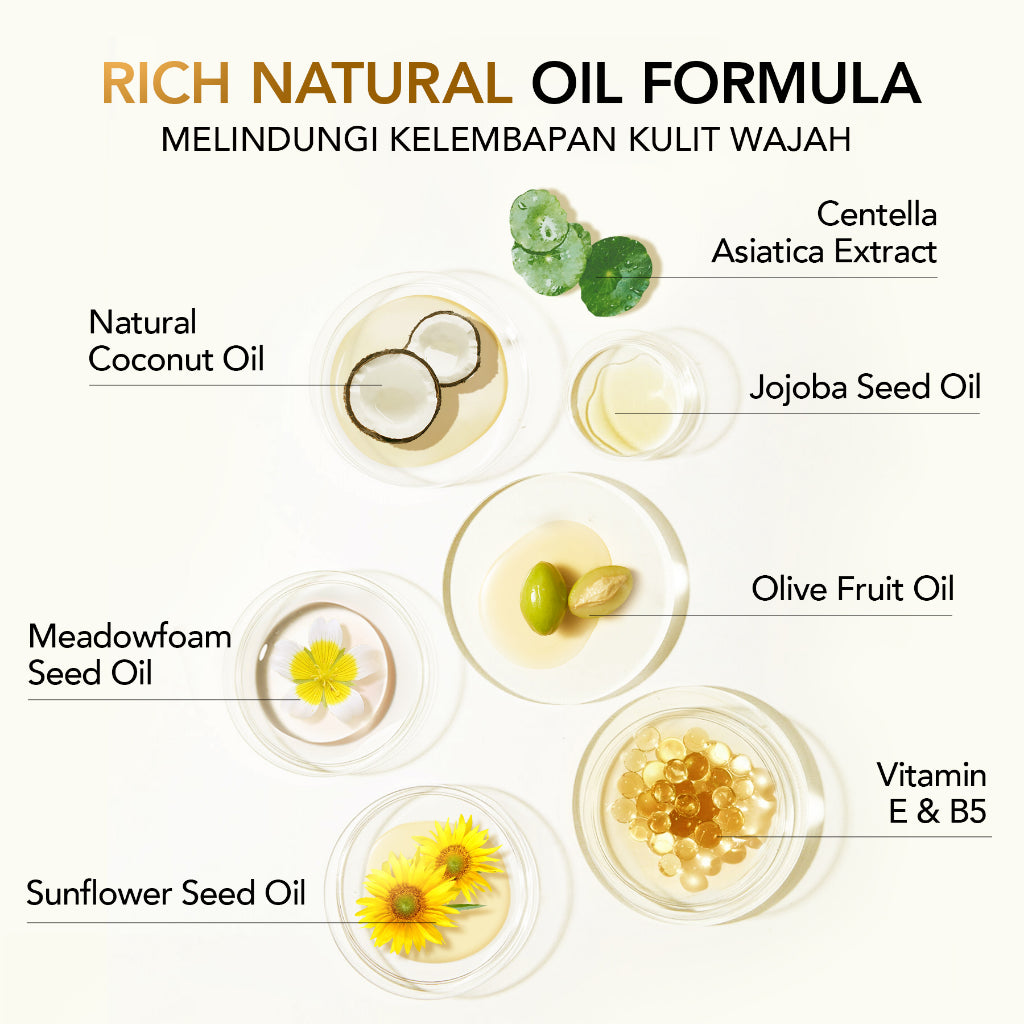 Natural Oils: Mengandung Coconut Oil, Jojoba Seed Oil, Olive Oil, Meadowfoam Seed Oil, memudahkan untuk melarutkan makeup