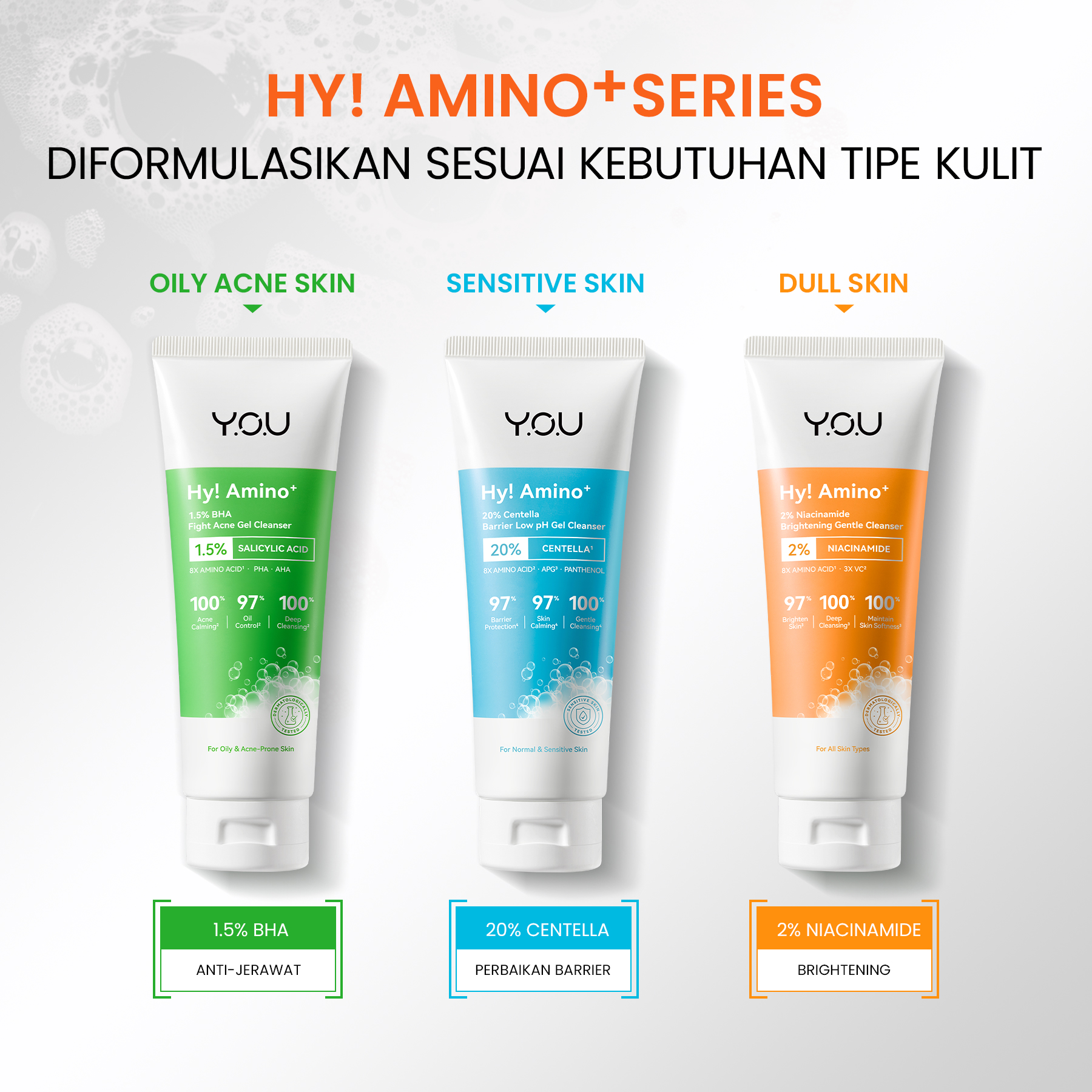 [NEW] YOU Hy! Amino+ 1.5% BHA Fight Acne Gel Cleanser, Gel pembersih wajah yang diformukasikan dengan 8X Amino Acid untuk membersihkan secara genlte hingga mendalam dan juga 1.5% Salicylic Acid untuk membersihkan pori, mengurangi minyak berlebih, sehingga kulit terasa segar dan sehat.